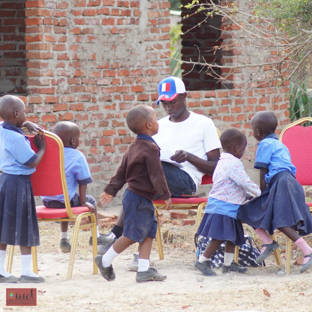 Mardi 21 Février, les enfants découvrent le nouvel agencement de la classe et les fournitures rangées dans le meuble. Ils sont heureux. Ils s’amusent avec les bouteilles sensorielles. Les paillettes brillent au soleil, c’est fascinant pour ces enfants ! Aujourd’hui Lusajo leur montre comment se laver les dents.